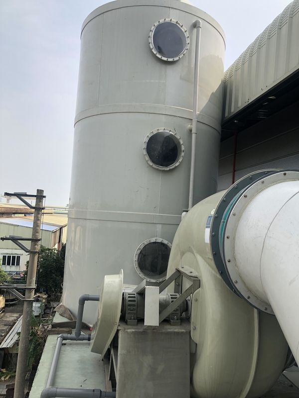 Sous la pression négative de la fan, le gaz d'échappement acide de brouillard entre dans l'épurateur de tour de plat de cyclone après le rassemblement de la couverture de rassemblement. La solution de l'agent est ajoutée avec de l'eau, de sorte que le gaz d'échappement soit déchargé à la norme. Après traitement, le pot d'échappement est déchargé à la haute altitude.